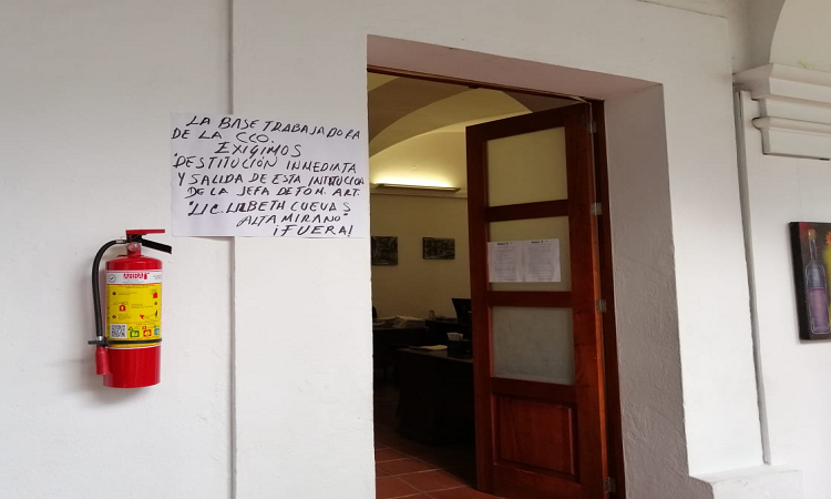 Oaxaca de Juárez.Trabajadores de la Casa de la Cultura Oaxaqueña (CCO) pararon labores este día para demandar a la jefa de Fomento Artístico, Lizbeth Cuevas por malos manejos.