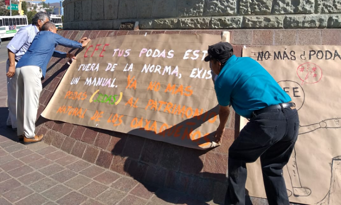 Oaxaca de Juárez. Integrantes del Colectivo de Organizaciones Ambientales de Oaxaca (COAO) se manifestaron este lunes en la Fuente de las ocho regiones contra la tala masiva de árboles que ha puesto en marcha la Comisión Federal de Electricidad (CFE) en la ciudad de Oaxaca de Juárez.