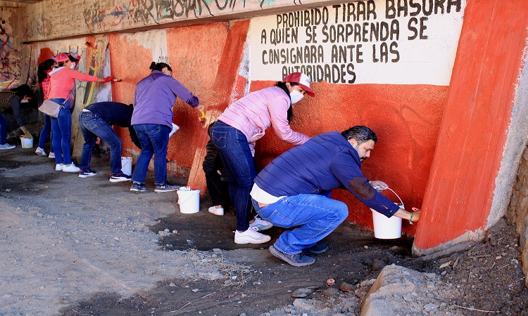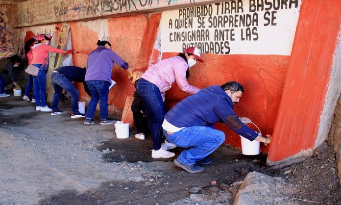 Desde las 8:00 horas, las y los vecinos de esta demarcación, así como servidoras y servidores públicos municipales e integrantes del comité de padres de familia de la Escuela Primaria “Hermanos Flores Magón”, se dieron a la tarea de deshierbar las zonas aledañas a la institución, recolectar residuos sólidos, limpiar y pintar los muros de la parte interna del Puente “Porfirio Díaz”, para brindar a este espacio una nueva imagen y generar mayor seguridad.
