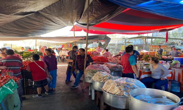 Sin cubrebocas y ninguna otra medida higiénica, se expenden frutas, verduras, chicharrón, carnes asadas, carnes frescas, entre otros.