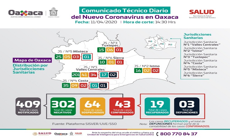 Informó que en total se han recibido 409 notificaciones -quitando el caso antes mencionado de la región del Papaloapan- de los cuales 302 son negativos y 64 casos están en proceso de estudio, 19 pacientes se han recuperado; así como tres defunciones –la última registrada este sábado de un hombre de 72 años, de la región de la Costa-.