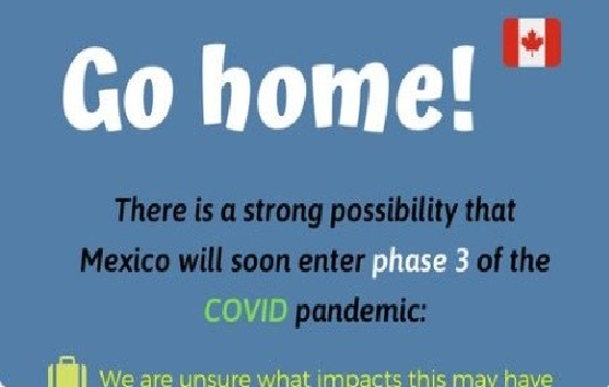 En su cuenta de Twitter el embajador Graeme C. Clark envió una serie de recomendaciones y advertencias donde a la vez que menciona la inminencia de que México entre pronto al siguiente periodo de la pandemia de Covid-19, les menciona que no hay seguridad sobre los impactos que esto puede tener en viajes domésticos e internacionales y que eventualmente podrían cancelarse los vuelos originalmente programados para regresar a Canadá en mayo o junio.
