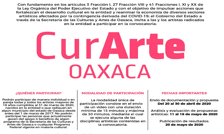 En apoyo a la comunidad artística que le permita mitigar el impacto económico por la contingencia sanitaria, el Gobierno del Estado, a través de la Secretaría de las Culturas y Artes de Oaxaca (Seculta), emitió la convocatoria CurArte, mediante la cual se pretende brindar 80 estímulos económicos por un monto individual de 10 mil pesos.