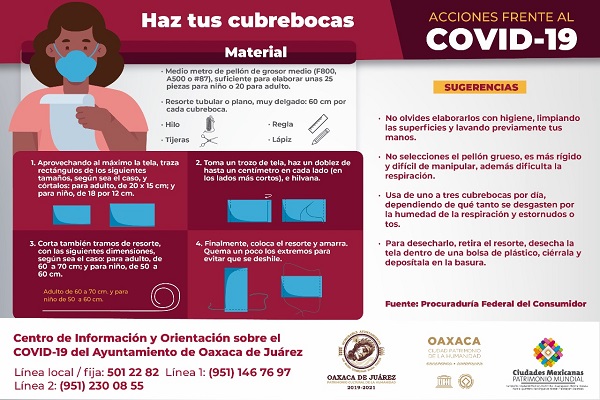Oaxaca de Juárez, Oax.- Ahora que en México ha comenzado la Fase 3 de la pandemia por COVID-19, es necesario incrementar y reforzar las medidas de prevención para evitar la propagación del coronavirus, por ello el Ayuntamiento de Oaxaca de Juárez te exhorta a elaborar tu cubrebocas en casa y cumplir con la disposición del Gobierno del Estado de usar de forma obligatoria este artículo en espacios y transporte públicos.