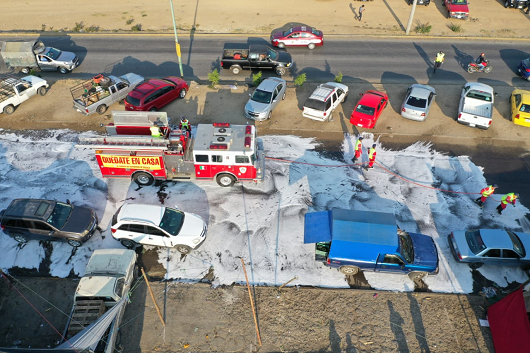 Oaxaca de Juárez. Elementos de la Secretaría de Seguridad Pública de Oaxaca y bomberos de la capital “lavaron” y sanitizaron las bodegas de la Central de Abasto.