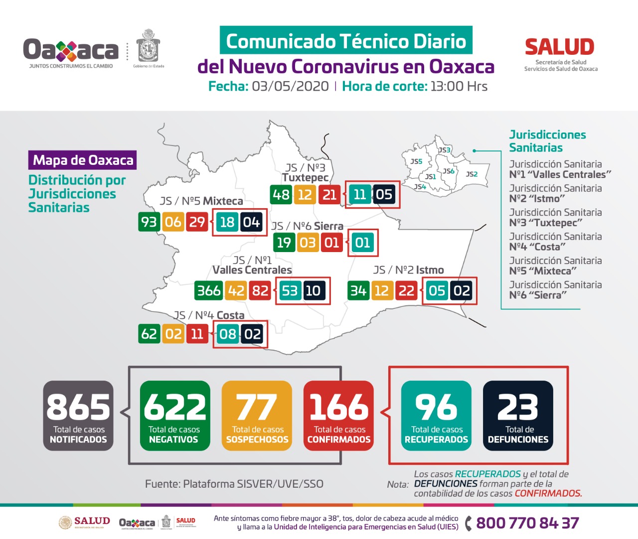 Oaxaca de Juárez, Oax.- Los Servicios de Salud de Oaxaca (SSO) informaron que en el corte epidemiológico de este domingo 3 de mayo, se han identificado tres nuevas personas portadoras del COVID-19, con esta cifra los casos acumulados llegan a los 166 positivos en el territorio oaxaqueño.