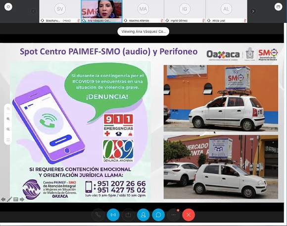 La secretaria de las Mujeres de Oaxaca, Ana Vásquez Colmenares Guzmán, habló de la importancia de que las mujeres tengan la certeza de auxilio inmediato y permanente por parte de instituciones de gobierno, por lo que desde el inicio de la contingencia sanitaria “difundimos por todos los medios, incluso perifoneo, mecanismos, números de atención y servicios”, puntualizó.