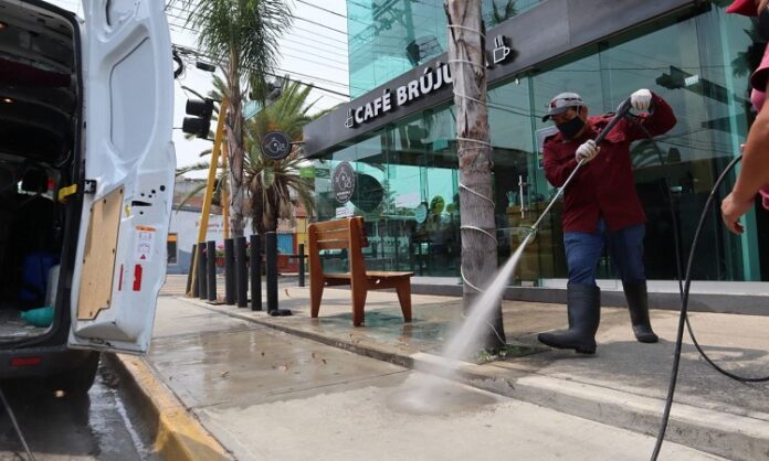 Ampliando la cobertura de los trabajos de saneamiento durante la Fase 3 de la pandemia por COVID-19, el Ayuntamiento de Oaxaca de Juárez, a través de la Coordinación Ejecutiva del Centro Histórico, emprende acciones de saneamiento y desinfección en instituciones educativas y comercios establecidos ubicados en el primer cuadro de la ciudad capital.