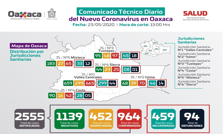 Al corte del día de hoy 23 de mayo, la Secretaría de Salud federal y consultados en la gráfica abierta de la Dirección General de Epidemiología se contabilizaron 964 casos confirmados, 452 en espera de resultados por laboratorio y desafortunadamente 94 decesos por este virus.