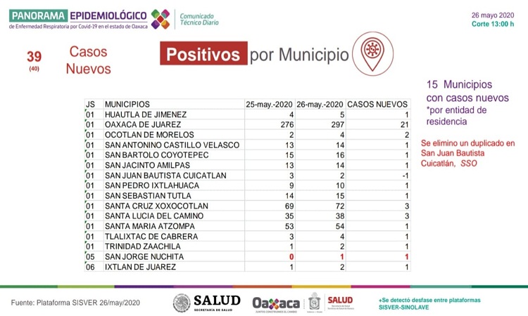 Mencionó que los 39 casos nuevos se encuentran distribuidos en 15 municipios, de los cuales Oaxaca de Juárez registra 21, Santa Cruz Xoxocotlán y Santa Lucia del Camino tres cada uno, Ocotlán de Morelos dos, entre otros.