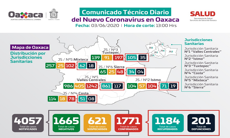 De igual forma, se confirmaron mil 771 casos positivos de los cuales 621 son sospechosos y mil 184 pacientes se han recuperado.