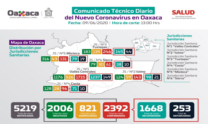 Los Servicios de Salud de Oaxaca informaron que en la entidad se han contabilizado 2 mil 392 casos confirmados, de los cuales 501 contagios están activos.