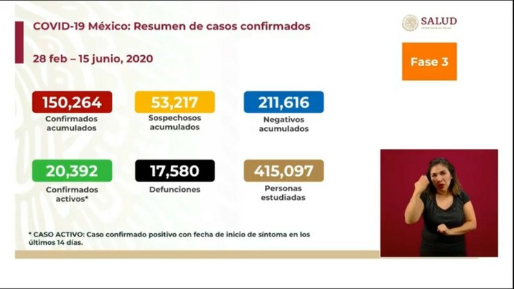 En las pasadas 24 horas se sumaron 3 mil 427 casos confirmados de la pandemia de Covid-19, para un registro acumulado de 150 mil 264. También se agregaron 439 decesos para un total de 17 mil 580 al día de hoy, informó José Luis Alomía, director de Epidemiología de la Secretaría de Salud.