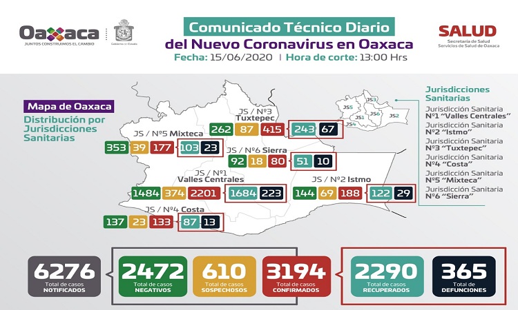 La Subdirectora general de Innovación y Calidad, Rosa Lilia García Kavanagh informó que Oaxaca de Juárez volvió a registrar el incremento más elevado de contagios entre los cortes del 14 y 15 de junio, con 20 casos confirmados; seguido de San Juan Bautista Tuxtepec, con 15 casos y Santiago Choapam que registró 13 nuevos contagios al mismo corte.