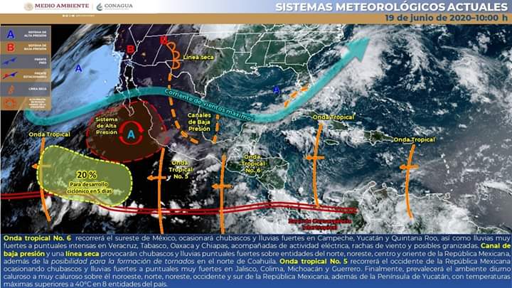 La onda tropical No. 6 recorrerá el sureste de México, ocasionará chubascos y lluvias fuertes en Campeche, Yucatán y Quintana Roo, así como lluvias muy fuertes a intensas en Veracruz, Tabasco, Oaxaca y Chiapas. Las lluvias podrán estar acompañadas de actividad eléctrica, rachas de viento al paso de las tormentas y posibles granizadas.