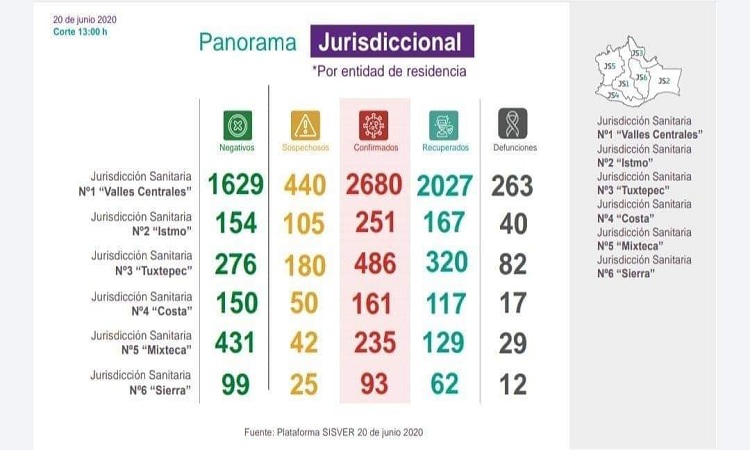 Detalló que la Jurisdicción Sanitaria número uno de Valles Centrales reporta dos mil 680 casos confirmados y 263 defunciones, el Istmo 251 y 40 defunciones, Tuxtepec 486 y 82 defunciones, Costa 161 y 17 defunciones, Mixteca 235 y 29 defunciones, y la Sierra 93 y 12 defunciones.