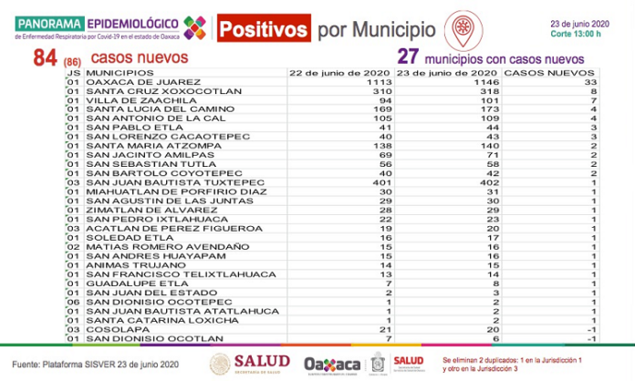 Oaxaca de Juárez. Los servicios de Salud de Oaxaca (SSO), informaron que este martes 23 de junio, 27 municipios de la entidad registraron nuevos casos positivos de COVID-19.