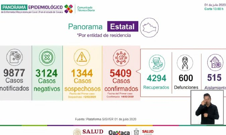 La subdirectora general de Innovación y Calidad de los Servicios de Salud de Oaxaca (SSO), Rosa Lilia García Kavanagh, indicó que este día se reportaron 7 decesos ocurridos en las últimas 24 horas, sumando un total de 600 muertes por la enfermedad causada por el virus SarS-CoV-2.