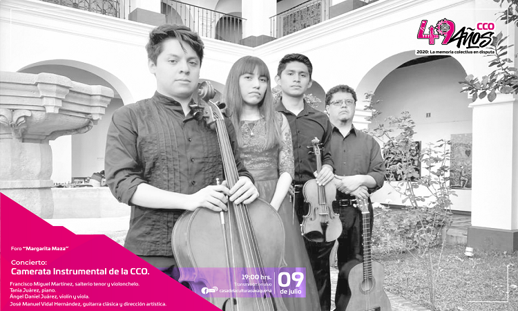 La Casa de la Cultura Oaxaqueña (CCO) invita este jueves 9 de julio al concierto virtual que ofrecerá la Camerata Instrumental de la institución, dirigida por el tallerista José Manuel Vidal Hernández, en la que sus integrantes ofrecerán un programa de música clásica de grandes compositores como Antonio Vivaldi, Erik Satie, Pyotr Ilyich Tchaikovsky y Frédéric François Chopin.