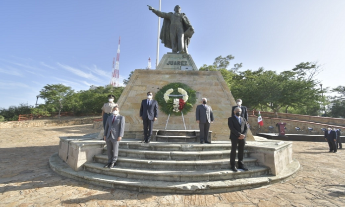En el Cerro del Fortín, al pie de la estatua erigida en honor de quien además de gobernador de Oaxaca fuera regidor del Ayuntamiento de Oaxaca, el orador oficial recalcó que la incansable labor, honradez y valor de Don Benito Juárez García deben ser un permanente recordatorio de que el trabajo por el pueblo de Oaxaca de Juárez, del Estado y de nuestro país, no tiene descanso.