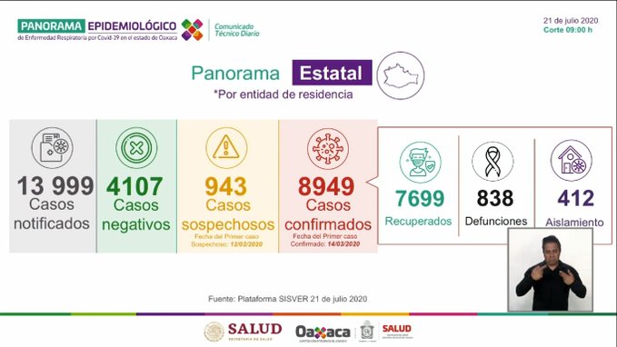Oaxaca de Juárez. Los Servicios de Salud de Oaxaca (SSO) confirmaron 157 casos nuevos de Coronavirus en la entidad oaxaqueña contabilizando un total de ocho mil 949 casos confirmados.