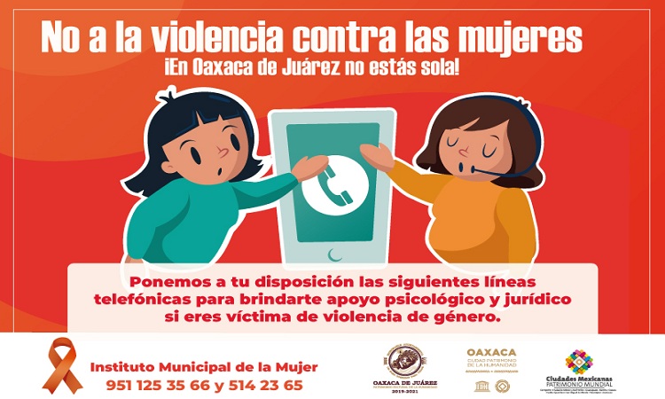 La titular del Instituto Municipal de la Mujer, Graciela Calvo Navarrete, expuso que en el número 951 125 3566 se brinda atención telefónica y vía WhatsApp, las 24 horas del día, a quienes deseen reportar alguna situación de violencia, así como solicitar información u orientación.