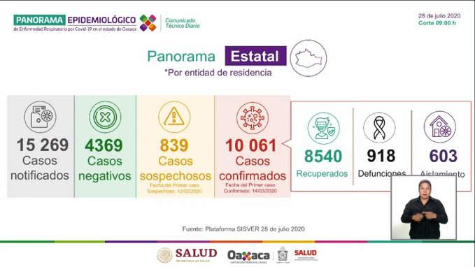De acuerdo al reporte, hasta la fecha se han confirmado 10 mil 061 casos confirmados y 918 defunciones, 839 sospechosos y 603 en aislamiento.