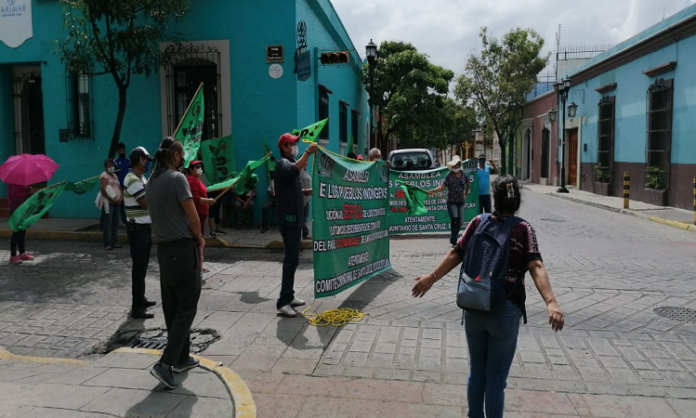Oaxaca de Juárez. Pese a los incrementos en contagios por COVID-19, integrantes de la Asamblea de los Pueblos Indígenas (API) y un grupo de desplazados de Xoxocotlán protestaron por cuarto día en los accesos de Casa Oficial, donde mantienen un bloqueo.