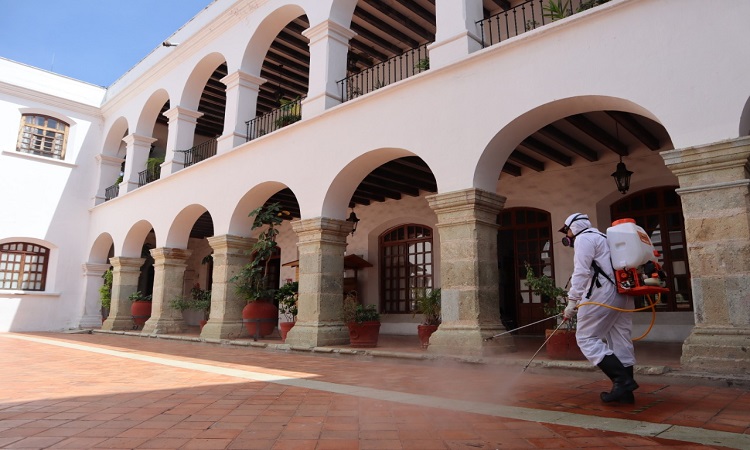 Equipadas con bombas de aspersión y soluciones a base de agua y alcohol, cuadrillas adscritas a la Coordinación Ejecutiva del Centro Histórico intervinieron todas las áreas del Palacio Municipal, incluyendo las oficinas de la Presidencia, Regidurías, instalaciones de las diferentes direcciones, cajas recaudadoras, baños, patios y pasillos, así como los salones Ex Presidentes y Porfirio Díaz Mori, este último es donde se realizan las Sesiones de Cabildo.