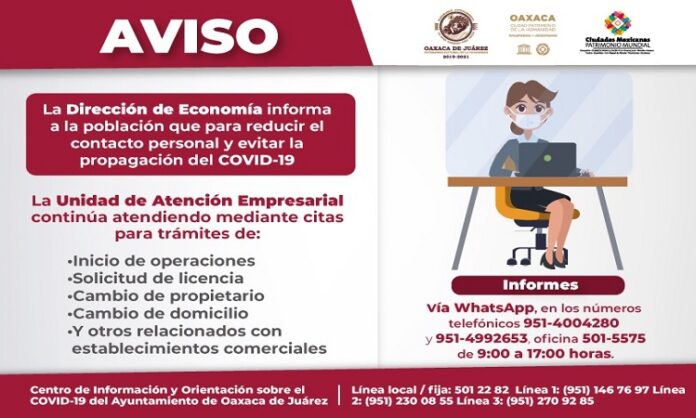 Para reanudar la atención al público, evitando la concentración de personas en edificios municipales y con ello evitar riesgos de contagio de COVID-19, el Ayuntamiento de Oaxaca de Juárez, puso a disposición de la ciudadanía un esquema de citas para efectuar trámites en la Unidad de Atención Empresarial de la Dirección de Economía.