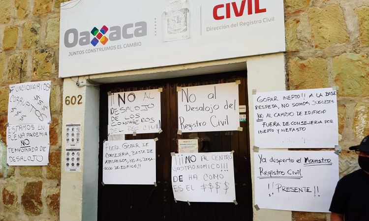 Oaxaca de Juárez. Trabajadores del Registro Civil de la Ciudad de Oaxaca, protestaron este jueves en su centro de trabajo ubicado en la calle de García Vigil para denunciar un presunto desalojo de sus instalaciones.