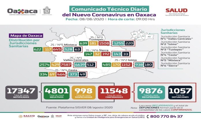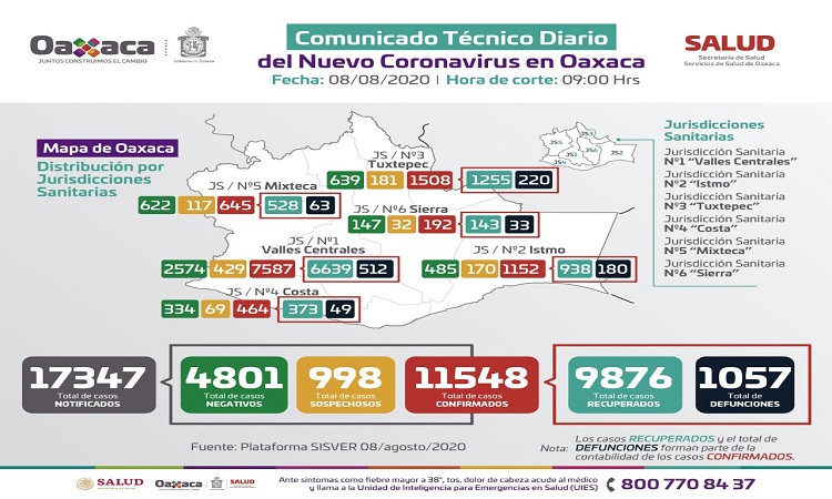 Especificó que por Jurisdicciones Sanitarias la incidencia del nuevo coronavirus se concentra en Valles Centrales con siete mil 587 casos, Tuxtepec con mil 508, el Istmo con mil 152, la Mixteca con 645, la Costa con 464 y la Sierra notificó 192 contagios.