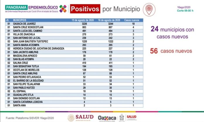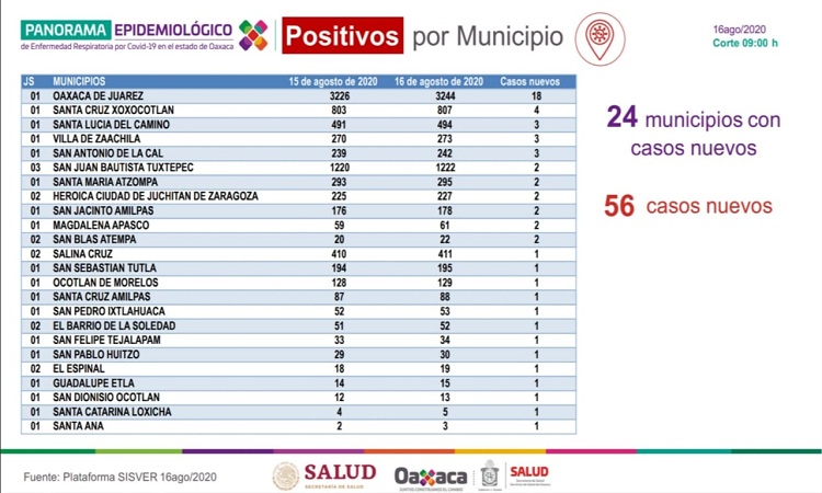 Casas Escamilla dijo que los 56 casos nuevos se registraron en 24 municipios, siendo los que el mayor número de casos presentaron Oaxaca de Juárez con 18, Santa Cruz Xococotlán cuatro, Santa Lucía del Camino, Villa de Zaachila, y San Antonio de la Cal tres cada uno, el resto dos y uno.