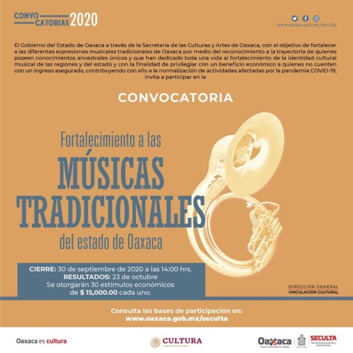 El Gobierno del Estado a través de la Secretaría de las Culturas y Artes de Oaxaca (Seculta), anunció la convocatoria de fortalecimiento de música tradicional, que otorgará 30 estímulos económicos de 15 mil pesos.