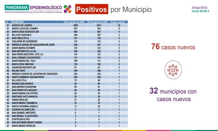 El titular de los Servicios de Salud de Oaxaca (SSO), Donato Casas Escamilla, informó que al corte epidemiológico de este 30 de agosto, se han contabilizado 76 casos nuevos a COVID-19, que suman 13 mil 650 acumulados en toda la entidad.