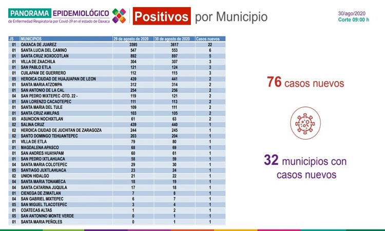 Sostuvo que, de los 76 casos nuevos, se distribuyen en 32 municipios, siendo el que mayor número presenta el de Oaxaca de Juárez con 22, Santa Lucía del Camino, seis; Santa Cruz Xoxocotlán, cinco; Villa de Zaachila, San Pablo Etla y Cuilapam de Guerrero tres cada uno; el resto dos y uno.