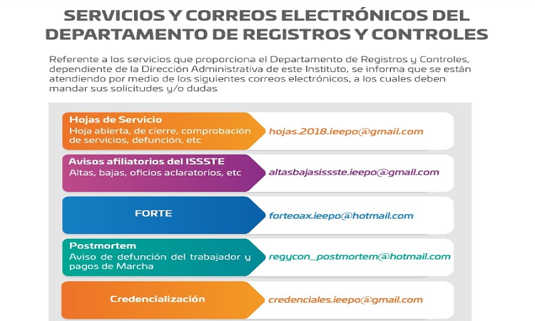 Para hojas de servicio (hoja abierta, de cierre, comprobación de servicios, defunción, entre otros), hojas.2018.ieepo@gmail.com; Avisos afiliatorios del ISSSTE (altas, bajas, oficios aclaratorios), altasbajasissste.ieepo@gmail.com; FORTE, forteoax.ieepo@hotmail.com; Postmortem (aviso de defunción del trabajador y pagos de Marcha), regycon_postmortem@hotmail.com; credencialización, credenciales.ieepo@gmail.com.