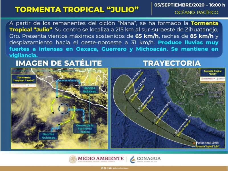 A las 16:00 horas, tiempo del centro de México, se formó la tormenta tropical Julio, a partir de los remanentes de Nana, al sur de las costas de Guerrero. Su centro se localizó aproximadamente a 215 kilómetros (km) al sur-suroeste de Zihuatanejo, en Guerrero, tiene vientos máximos sostenidos de 65 kilómetros por hora (km/h), rachas de 85 km/h y desplazamiento hacia el oeste-noroeste a 31 km/h.