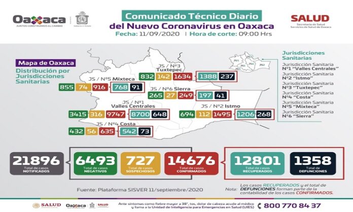 El jefe del Departamento de Prevención y Control de Enfermedades Transmitidas por Vector, de los Servicios de Salud de Oaxaca (SSO), Jorge Concha Suárez, informó que al corte epidemiológico de este viernes 11 de septiembre se tienen contabilizados 84 contagios nuevos de COVID-19 en 30 municipios, sumando 14 mil 676 casos acumulados en la entidad.