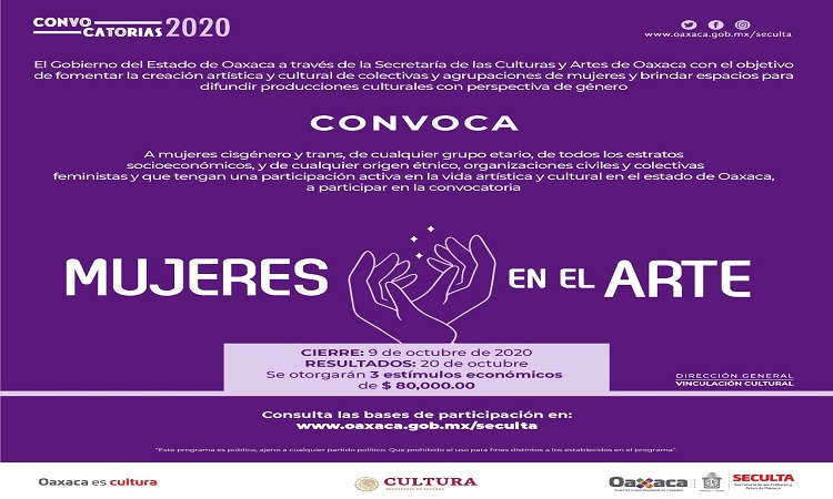 El Gobierno del Estado de Oaxaca a través de la Secretaría de las Culturas y Artes de Oaxaca (Seculta), presentó la convocatoria Mujeres en el Arte, que otorgará tres estímulos económicos de 80 mil pesos cada uno.