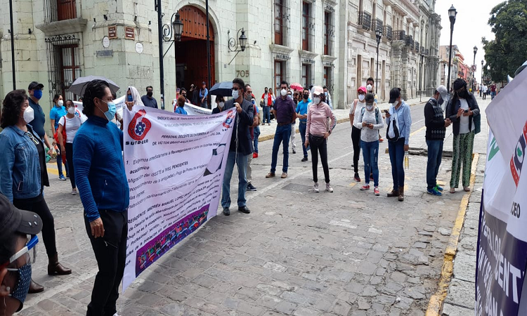 Los inconformes bloquearon la calle Independencia en el centro de la ciudad de Oaxaca para denunciar diversas violaciones e incumplimiento a su contrato laboral.