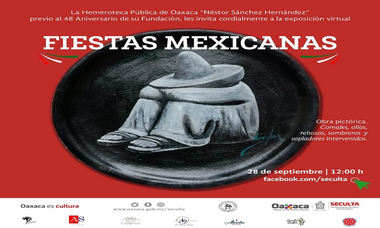 La Secretaría de las Culturas y Artes de Oaxaca (Seculta), a través de la Hemeroteca Pública de Oaxaca “Néstor Sánchez Hernández”, invita al público en general a conocer la exposición pictórica y de artes aplicadas “Fiestas Mexicanas”, la cual será transmitida el próximo 28 de septiembre a través de https://www.facebook.com/seculta/.
