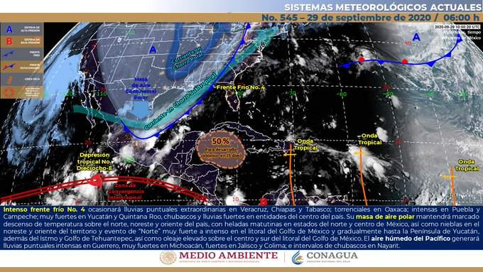 Para hoy, el intenso frente frío No. 4 recorrerá el sur del litoral del Golfo de México, el oriente y sureste del territorio nacional, además de aproximarse en horas nocturnas a la Península de Yucatán, lo que ocasionará lluvias puntuales extraordinarias en Veracruz, Chiapas y Tabasco; torrenciales en Oaxaca; intensas en Puebla y Campeche; muy fuertes en Yucatán y Quintana Roo, así como fuertes en Hidalgo, Tlaxcala, Morelos y Estado de México, las cuales se acompañarán de descargas eléctricas y posible caída de granizo; intervalos de chubascos en Querétaro y Ciudad de México y lluvias aisladas en Tamaulipas, San Luis Potosí y Guanajuato.