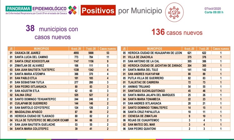 Los 136 casos nuevos, se distribuyen en 38 municipios de la entidad, siendo los que mayor número de casos presentan, el de Oaxaca de Juárez con 53, Santa Lucia del Camino 11, Santa Cruz Xoxocotlán nueve, Zimatlán de Alvarez cinco, el resto cuatro, tres, dos y un solo caso.