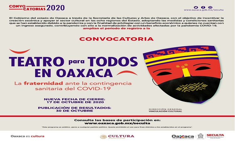 El Gobierno del Estado a través de la Secretaría de las Culturas y Artes de Oaxaca (Seculta), informa a las y los interesados que la Convocatoria “Teatro para Todos en Oaxaca. La fraternidad ante la contingencia sanitaria del COVID-19”, amplía su plazo de cierre al sábado 17 de octubre del año en curso, por lo que invita a consultar las bases en: https://www.oaxaca.gob.mx/seculta/convocatoria-teatro-para-todos-en-oaxaca/.