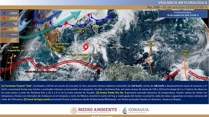 Viento con rachas de 120 a 150 km/h y oleaje de 4 a 7 metros de altura: Costa norte de Yucatán y de Quintana Roo.