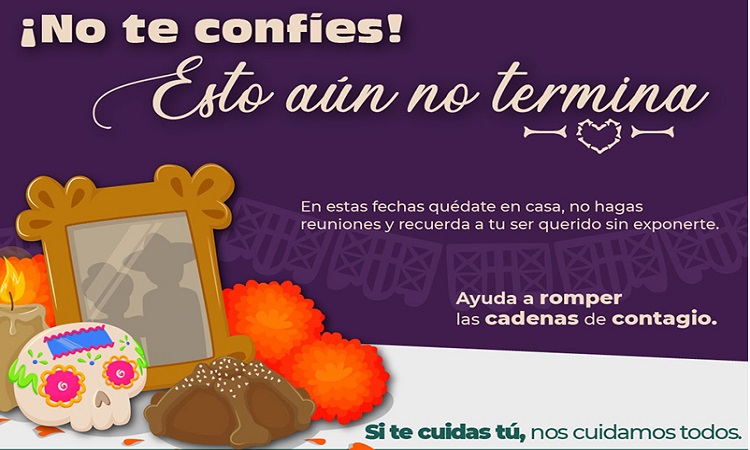 Por otra parte, invitó a la gente a no acudir a los panteones en estas fechas, pero si deciden hacerlo, es necesario que respeten la sana distancia, considerar los horarios con menor afluencia, practicando las medidas de higiene y protección en todo momento.