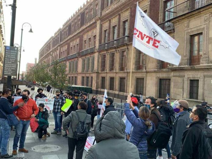 Maestros de la Coordinadora Nacional de Trabajadores de la Educación (CNTE) se manifestaron esta mañana frente a la puerta número uno de Palacio Nacional.