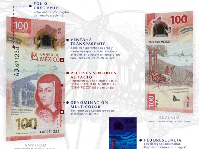El Banco de México (Banxico) presentó esta tarde el nuevo billete de 100 pesos, fabricado en polímero, en el que aparece la imagen de Sor Juana Inés de la Cruz y el ecosistema de bosques templados Reserva de la Biósfera Mariposa Monarca, patrimonio natural de la humanidad.