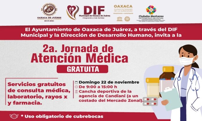 Refrendando el compromiso de propiciar estrategias e iniciativas que abonen al bienestar de los sectores más desprotegidos, el Ayuntamiento de Oaxaca de Juárez, a través del DIF Municipal y la Dirección de Desarrollo Humano, invita a la Segunda Jornada de Atención Médica Gratuita que se realizará el próximo domingo 22 de noviembre en la agencia de Candiani, de las 9:00 a las 15:00 horas.